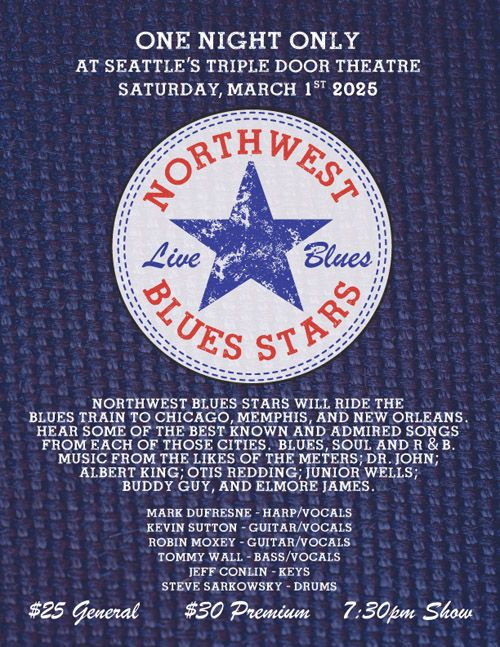 Following up on their sold out show last February, the NORTHWEST BLUES STARS return to Seattle’s TRIPLE DOOR on SATURDAY, MARCH 1, 2025 AT 7:30pm. While focused on the blues, this time the all- star 6-piece band will ride the blues train to Chicago, Memphis and New Orleans and feature some of the greatest songs to come out of each of those cities. NBS is produced by STEVE SARKOWSKY who was the founder and primary talent buyer for the award-winning HIGHWAY 99 BLUES CLUB. He has produced a variety of all star shows over the past 20 years and brings the latest version to the Triple Door. “This show gives the band a chance to play some of the best known and admired songs from each of those vital cities” said Sarkowsky. “Each of those cities has a rich history and tradition of fantastic music, legendary artists and a unique sound” he added. Artists such as The Meters; Dr, John; Irma Thomas; Albert King; Otis Redding; Junior Wells; Little Walter; Buddy Guy and Elmore James to name just a few to be featured. Scheduled to appear with the Northwest Blues Stars this time will be: KEVIN SUTTON on guitar and vocals; ROBIN MOXEY on guitar and vocals; TOMMY WALL on bass and vocals; JEFF CONLIN on keys and STEVE SARKOWSKY on drums and MARK DUFRESNE on harp and vocals. This is a lineup heavy on experience and that has played throughout the Northwest over the years. The last show sold out and tickets are now on sale thru the Triple Door website. Special thanks to the Washington Blues Society (WBS) and radio station KNKX for all they do for keeping the blues alive.